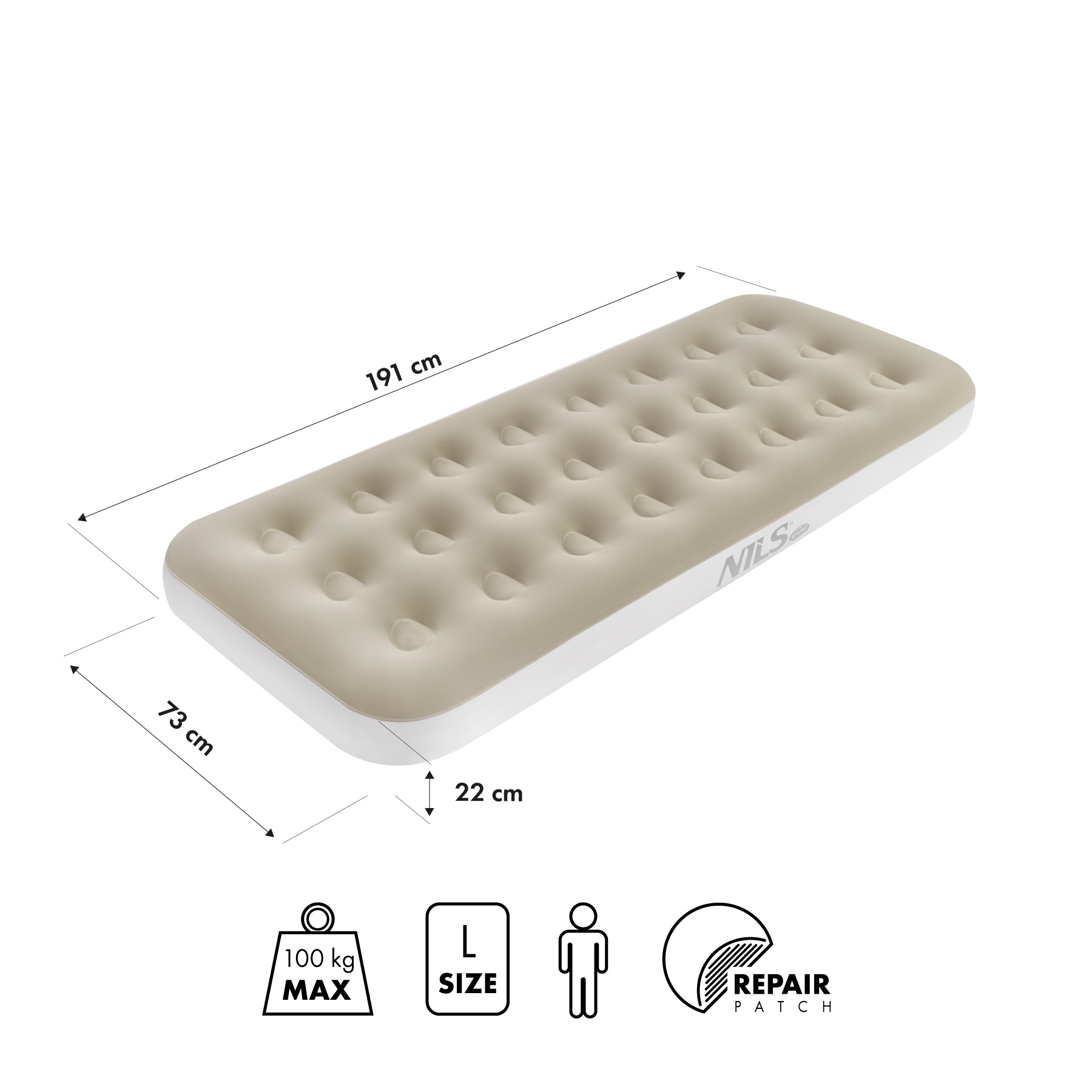 Protiskluzový povrch matrace zajišťuje stabilitu i při změně polohy během spánku. Díky maximální nosnosti až 120 kg jej mohou používat osoby s různou tělesnou stavbou. Výška 22 cm zvyšuje komfort užívání – poskytuje dostatečnou izolaci od podkladu, což je obzvlášť důležité při venkovním použití.